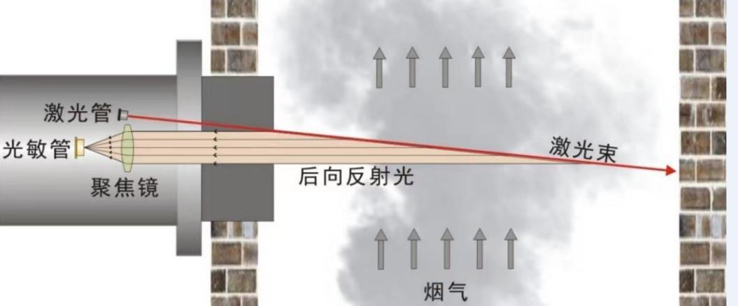 激光后散射粉塵(煙塵)儀采用激光后向散射測試原理完成對被測煙道的煙塵濃度的測定,其內嵌的高穩定激光信號源穿越煙道,照射煙塵粒子,被照射的煙塵粒子將反射激光信號,反射的信號強度與煙塵濃度成正變化。檢測煙塵反射的微弱激光信號,通過特定的算法即可計算出煙道煙塵的濃度。